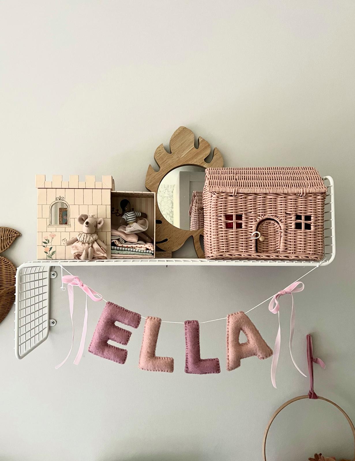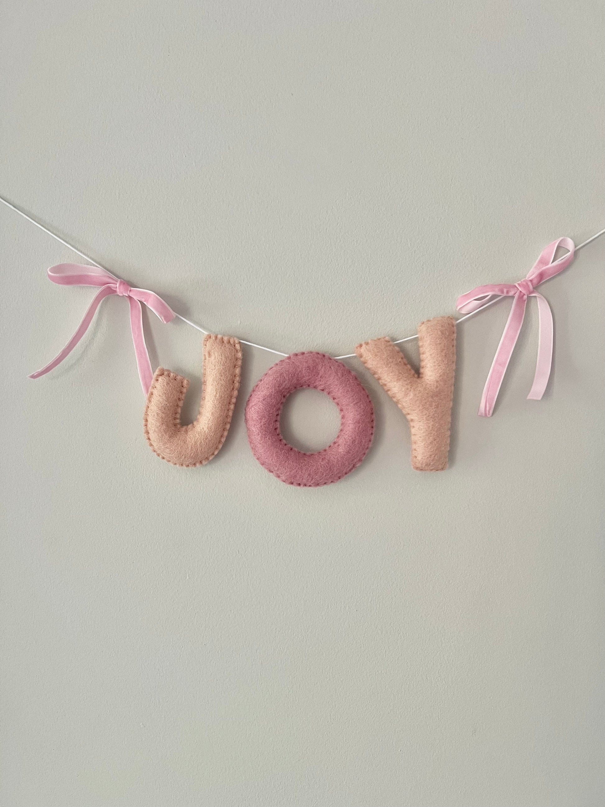 Handmade with love, this charming garland is crafted from 100% wool felt alternating two different shades of pink. Each letter is carefully hand-stitched and the garland finished off by two cute velvet bows on both ends.