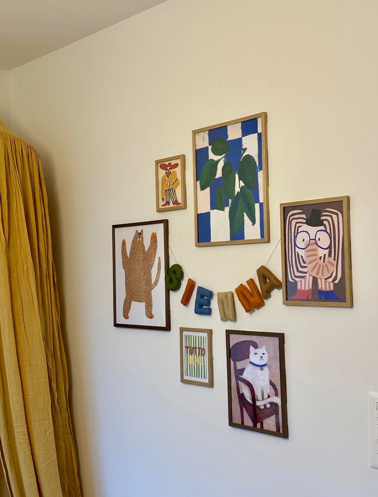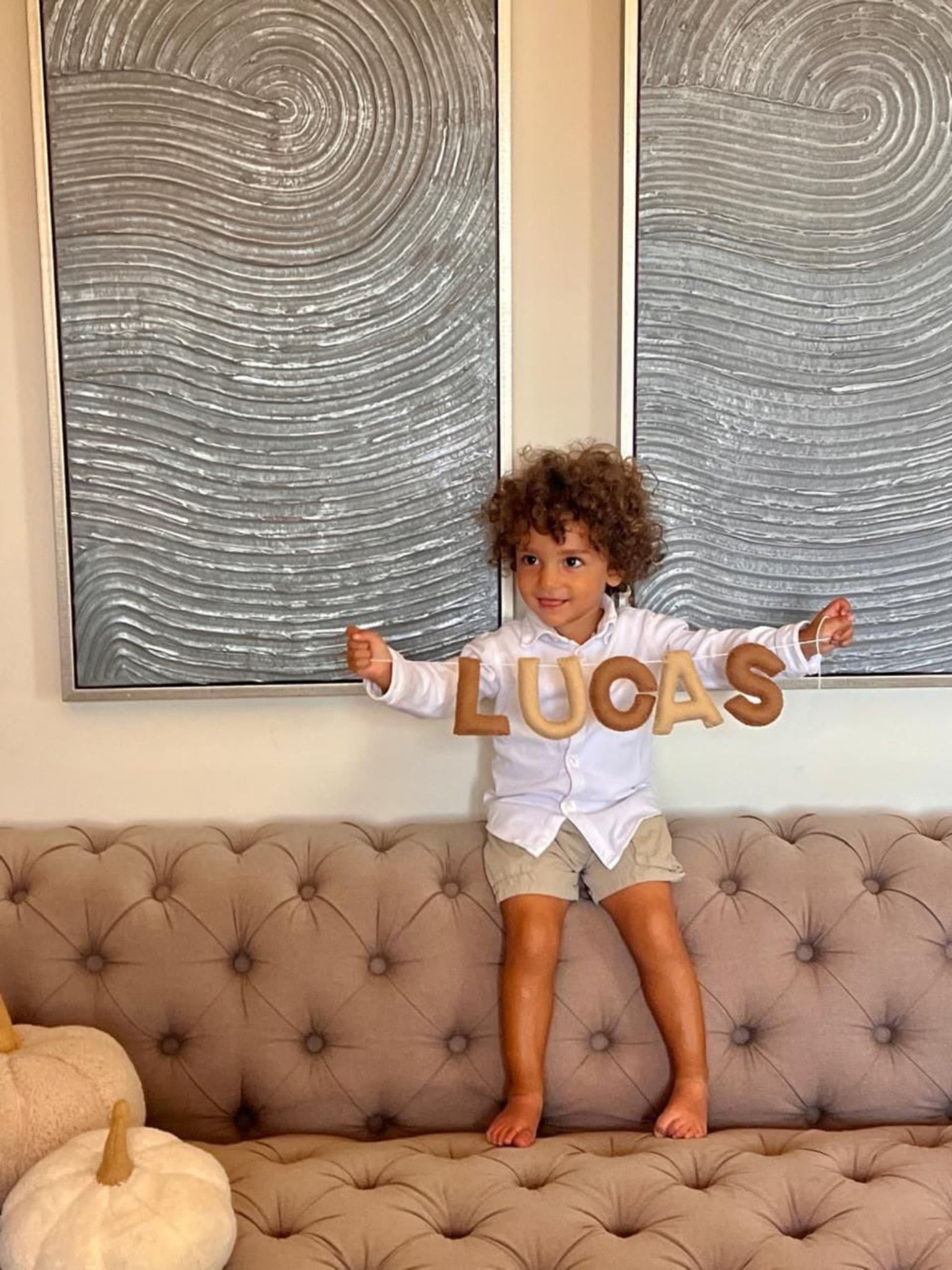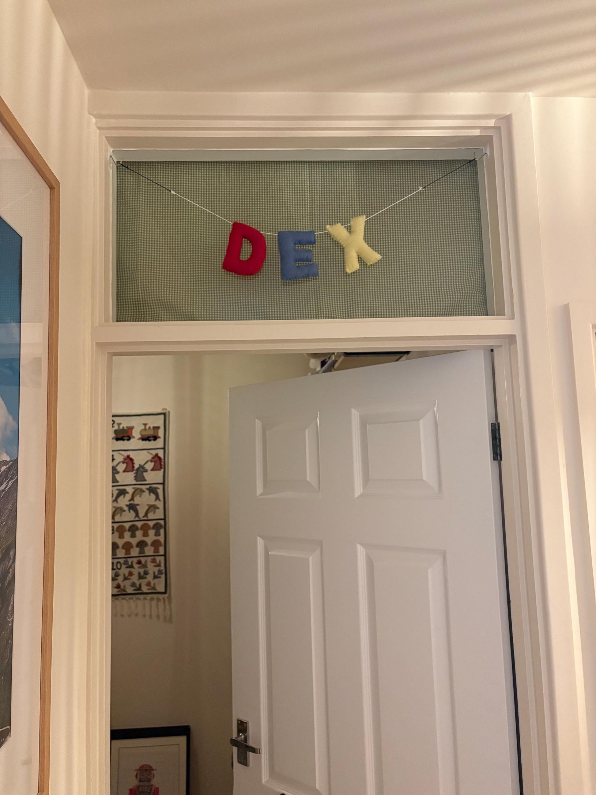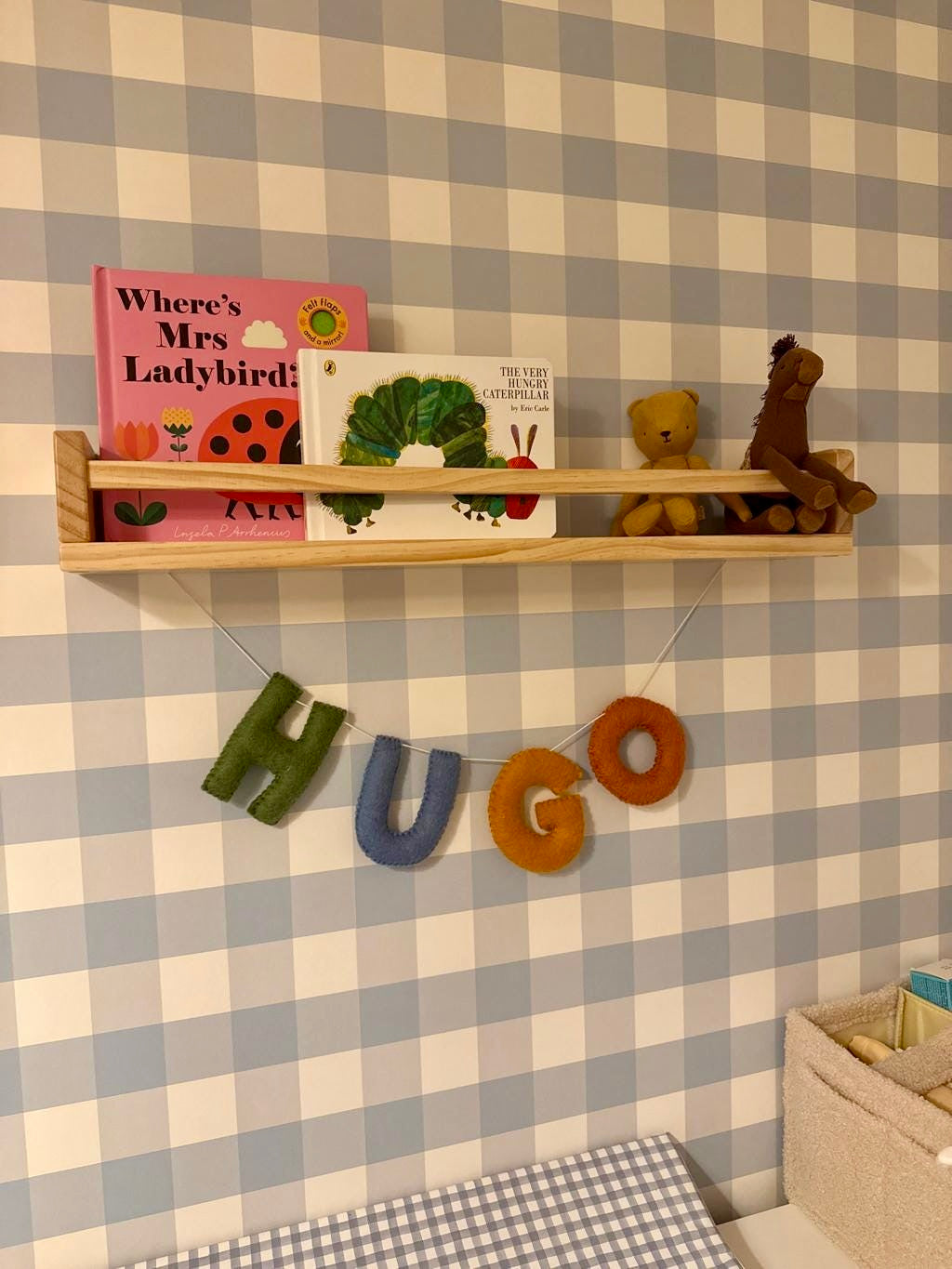A hand stitched name garland that to add a personal touch to a little person’s bedroom or nursery. It gives a nice focal point to the room and could be hanged above cots, changing stations or attached to shelves. The letters are approximately 10 cm tall.