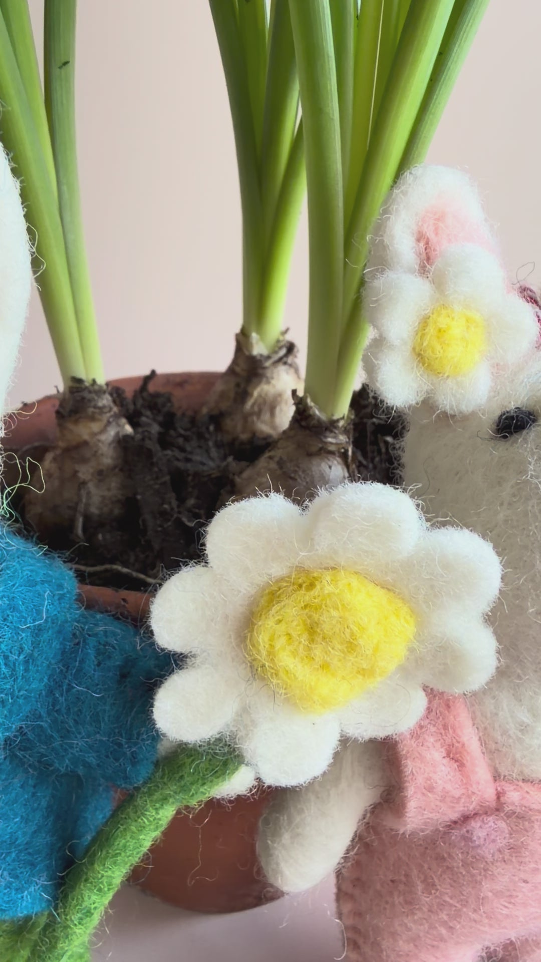 Millie, in soft blush tones, holds a small carrot, while Oliver carries a single daisy in muted blue and green. Together, they bring a subtle sense of warmth and balance to a shelf, table or seasonal display.