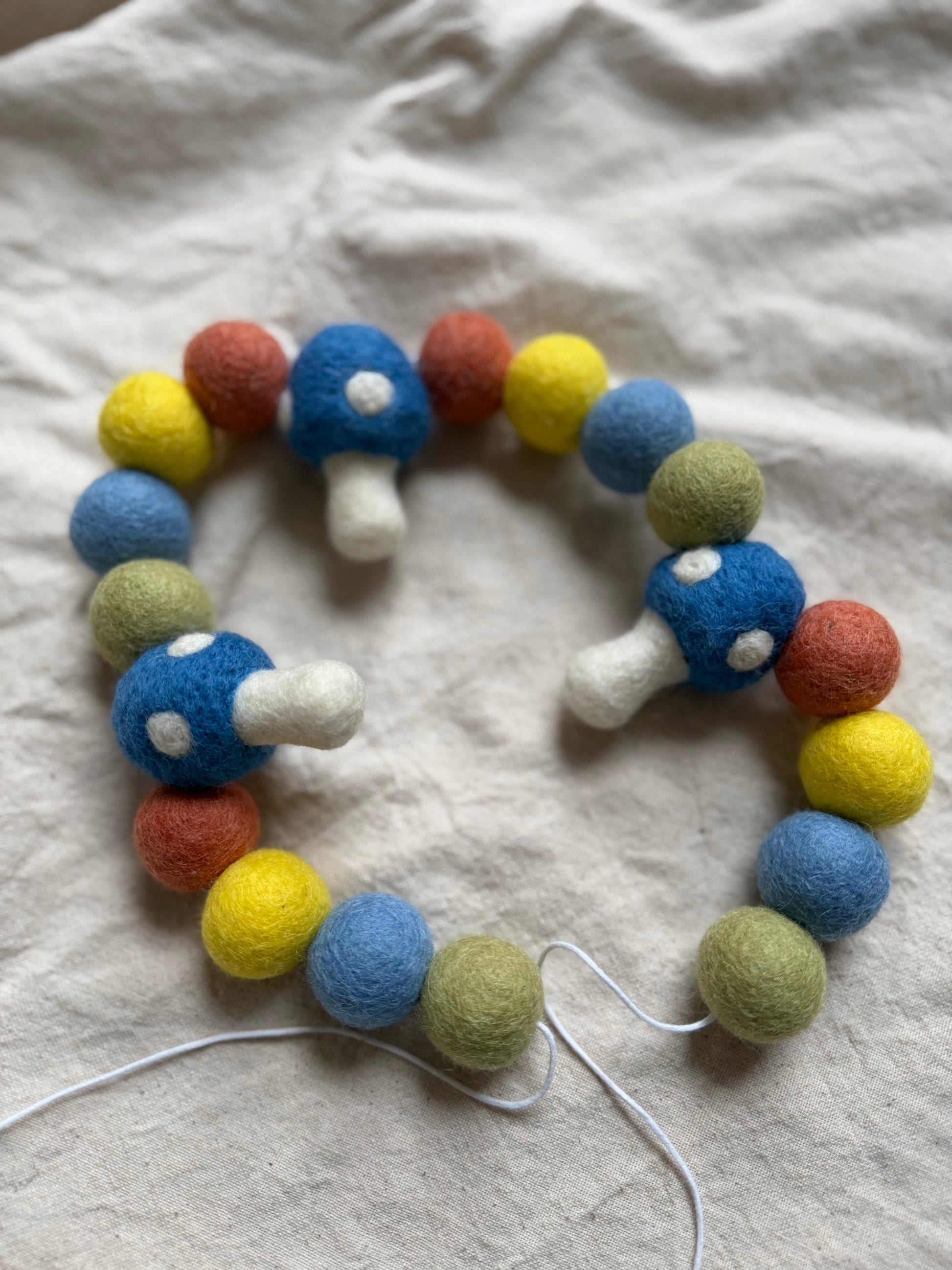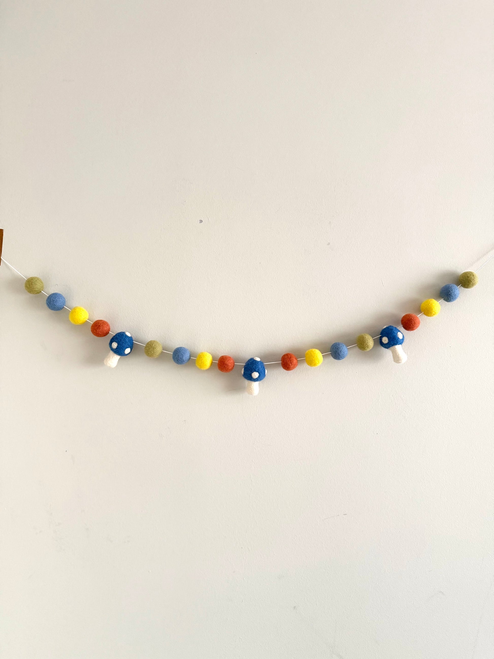 A felt pompom garland comprises 16 balls and 3 mushrooms. It makes a perfect decor for your nursery or playroom. The balls are 2.5 cm in diameter and made out of 100% wool.